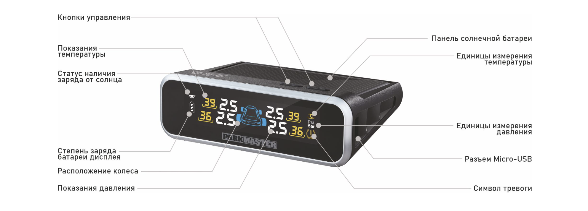 Система контроля давления и температуры в шинах на солнечной батарее Parkmaster TPMS 4-22 (4 внутренних датчика)